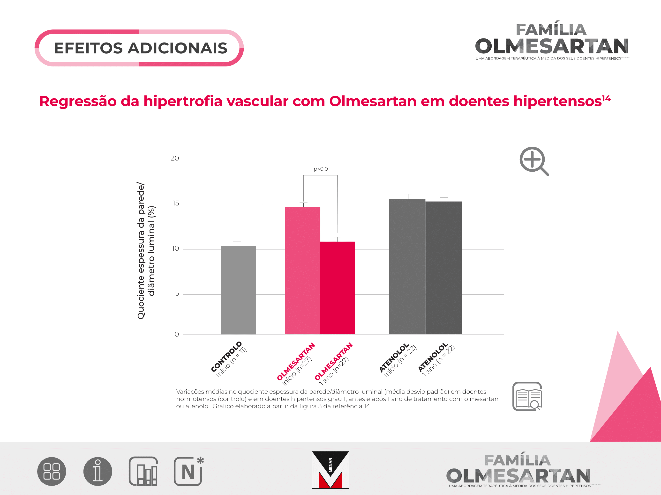 Após um ano de tratamento, o quociente espessura da parede/ diâmetro luminal das arteríolas diminuiu significativamente nos doentes tratados com Olmesartan (de 14,9% para 11,1%; p< 0,01).
