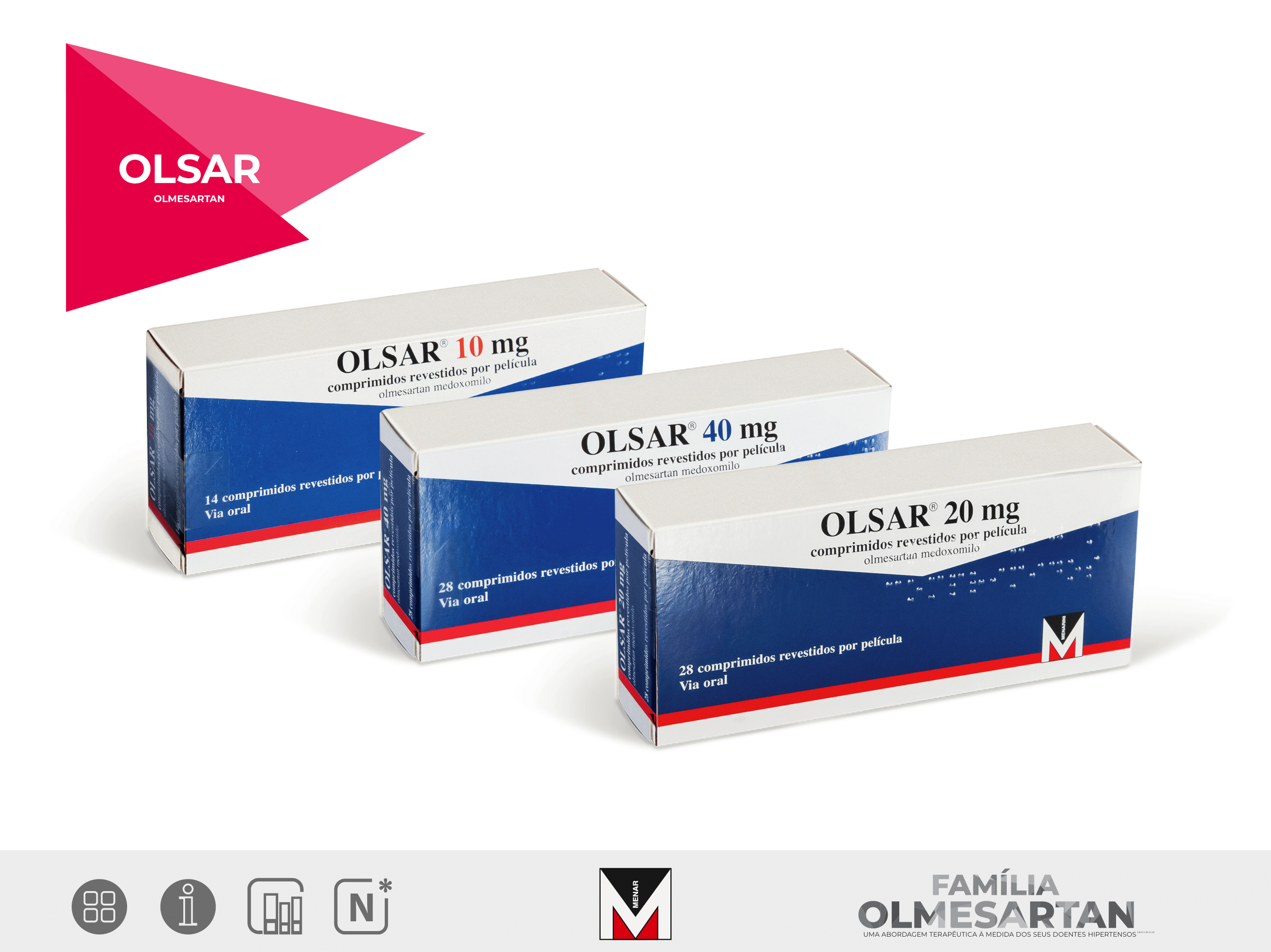 Comprimido revestido por película. Olsar 10 e 20 mg comprimidos: cor branca, forma circular, comprimidos revestidos por película com C13 e C14 gravado num dos lados, respetivamente. Olsar 40 mg comprimidos: cor branca, forma oval, comprimidos revestidos por película com C15 gravado num dos lados.INFORMAÇÕES CLÍNICAS